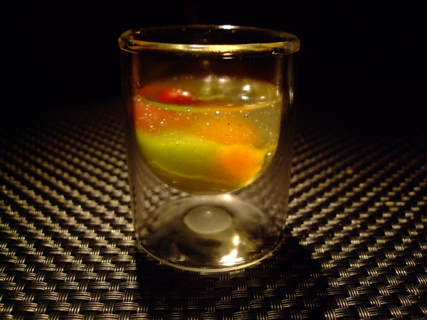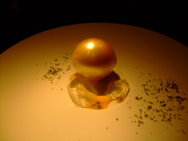 Le sucre- sphere passion fruit mousse with coconut milk 珍珠糖球搭配椰奶和百香果慕斯。好漂亮的金球,捨不得把他打破!!