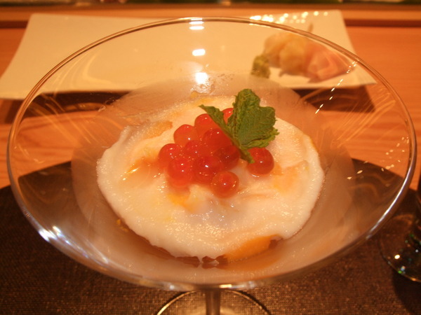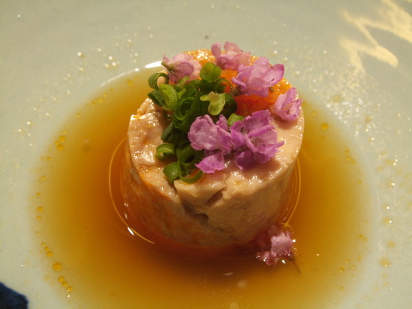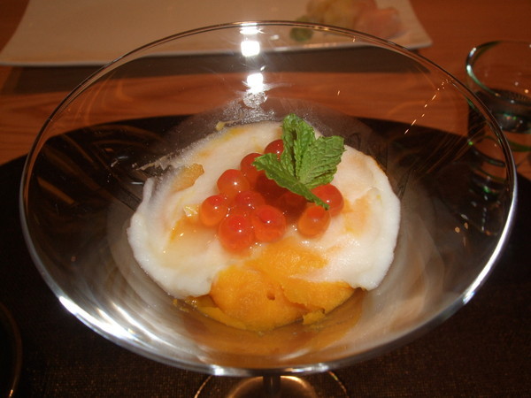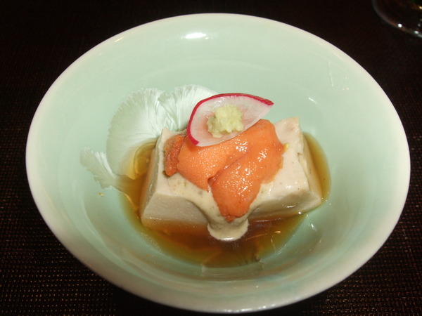 胡麻豆腐佐海膽。胡麻豆腐的芝麻香非常濃郁,豆腐上面的醬汁適用八種堅果磨製而成的,堅果的香氣與口感十足。