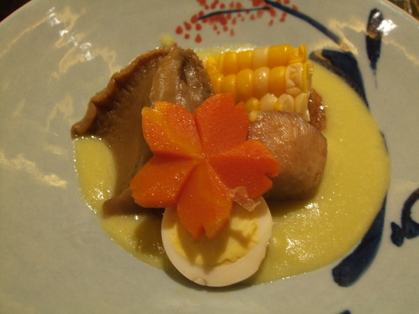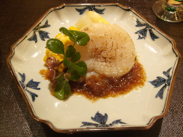 日本干貝搭配法國白蘆筍和台灣竹筍和日本北海道甜玉米,底下的SAUCE是洋蔥泥,干貝很甜但蔬菜的甜度也絲毫不遜色。
