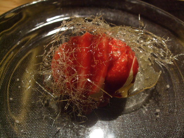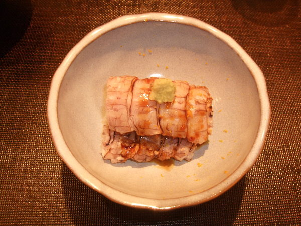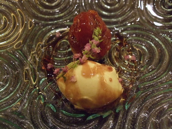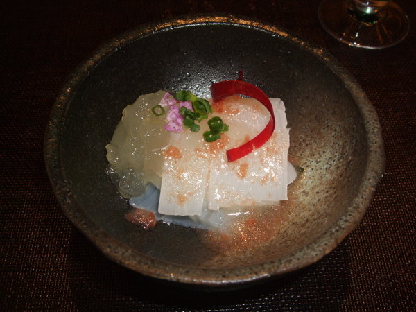 墨魚佐梅子醬汁與柚子凍,阿鴻師傅刻意把墨魚整隻都給我們吃看看.腳拿去扮明太子,身體則做成這道,酸酸甜甜的很開胃。