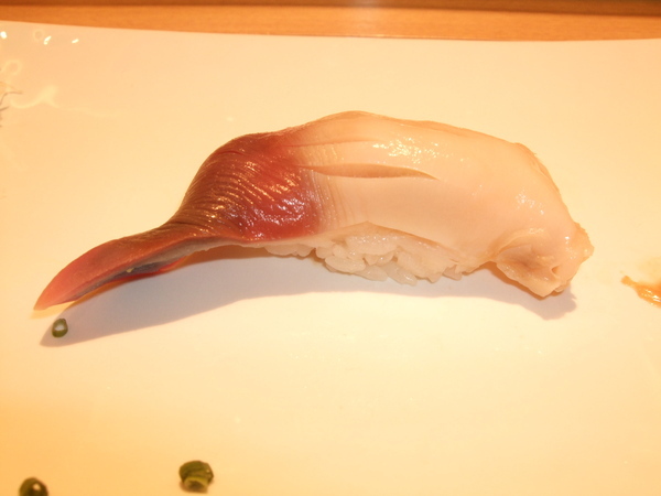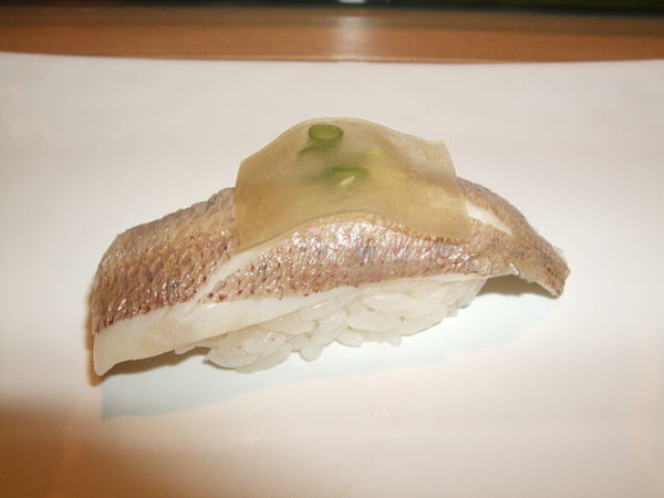 春子鯛握壽司。上面放一片白昆布,第一次吃小的血鯛(春子鯛)之前都吃小鯛。