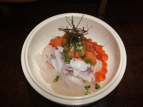白蝦、蝦蛄觸角的肉(一隻蝦蛄才兩個)、海膽、鮭魚卵的散壽司。今天的海膽是北海道的白馬糞海膽,好吃的不得了。