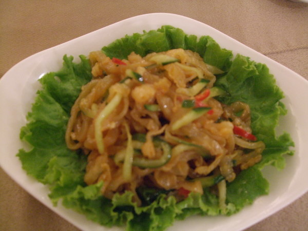 鮑魚沙拉,現在的養殖鮑技術不錯,讓偷懶的中餐廳拿些青菜切一切淋些日式醬汁,丟個養殖鮑就可以賣很多錢了。